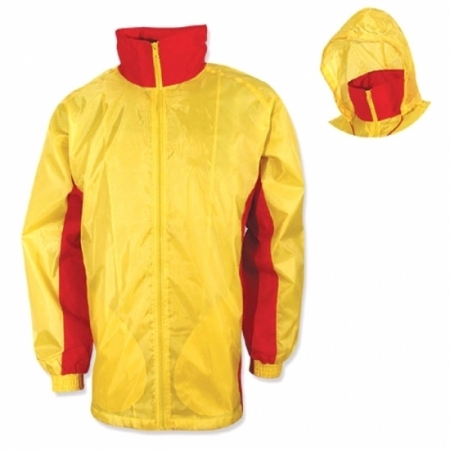 Snap Cuffs, wind and waterproof. Vented back. Detachable snap hood. Adjustable shoulder straps. Cut for comfort. Snap fly.